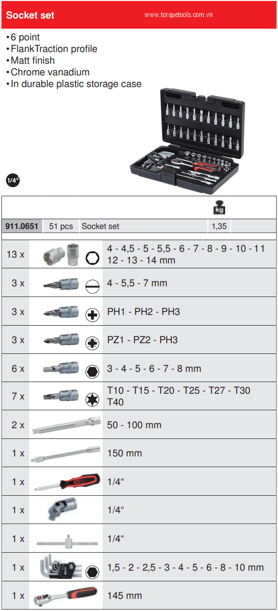 - Khẩu 6 cạnh 1/4"(4-14 mm): 13 chiếc.