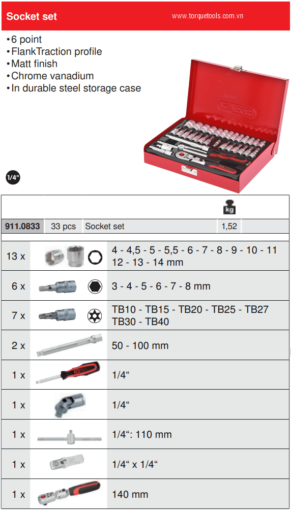 - Khẩu 6 cạnh 1/4"(4-14 mm): 13 chiếc.