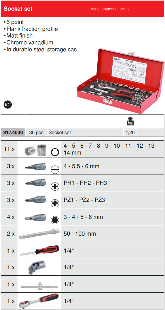 Bộ dụng cụ Ks Tools 917.4030, bộ khẩu Ks Tools 917.4030 là hộp dụng cụ 30 chi tiết, size khẩu đầu vào 1/4", chuyên dùng để siết/vặn bulong, đai ốc, vít trong công nghiệp.Các chi tiết trong bộ khẩu Ks Tools 917.4030 gồm: