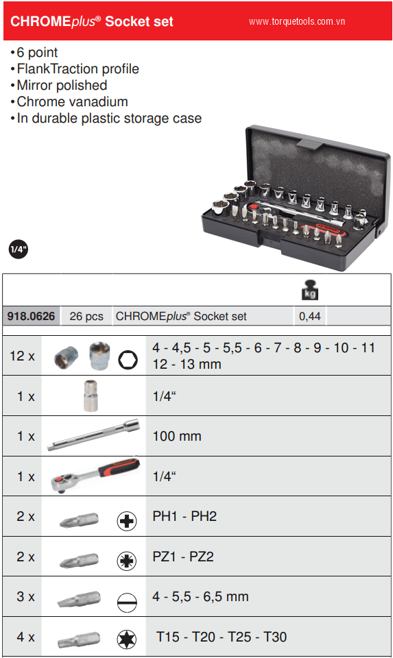 Bộ dụng cụ Ks Tools 918.0626, bộ khẩu Ks Tools 918.0626 là hộp dụng cụ 26 chi tiết, size khẩu đầu vào 1/4", chuyên dùng để siết/vặn bulong, đai ốc, vít trong công nghiệp.Các chi tiết trong bộ khẩu Ks Tools 918.0626 gồm: