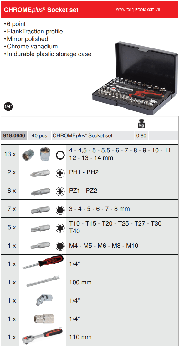 - Khẩu 6 cạnh 1/4"(4-14 mm): 13 chiếc.