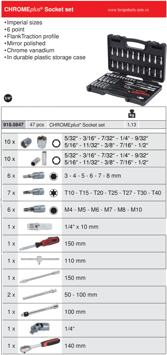 - Khẩu 6 cạnh dài 1/4"(5/32-1/2"): 10 chiếc.