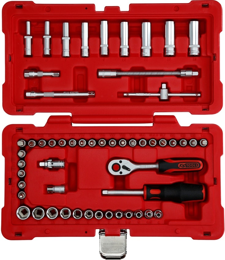 Bộ dụng cụ Ks Tools 951.0654, bộ khẩu Ks Tools 951.0654 là hộp dụng cụ 54 chi tiết, size khẩu đầu vào 1/4", chuyên dùng để siết/vặn bulong, đai ốc, vít trong công nghiệp.Các chi tiết trong bộ khẩu Ks Tools 951.0654 gồm:
