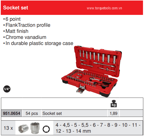 - Khẩu 6 cạnh 1/4"(4-14 mm): 13 chiếc.