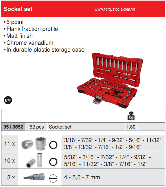 - Khẩu 6 cạnh dài 1/4"(5/32-1/2"): 10 chiếc.
