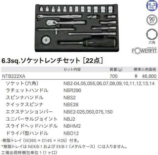 Toàn bộ bộ khẩu KTC NTB222XA đóng trong hộp nhựa, trọng lượng: 705 g. Made in Japan.