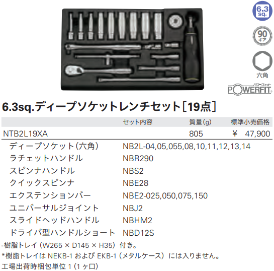 Toàn bộ bộ khẩu KTC NTB2L19XA đóng trong hộp nhựa, trọng lượng: 805 g. Made in Japan.