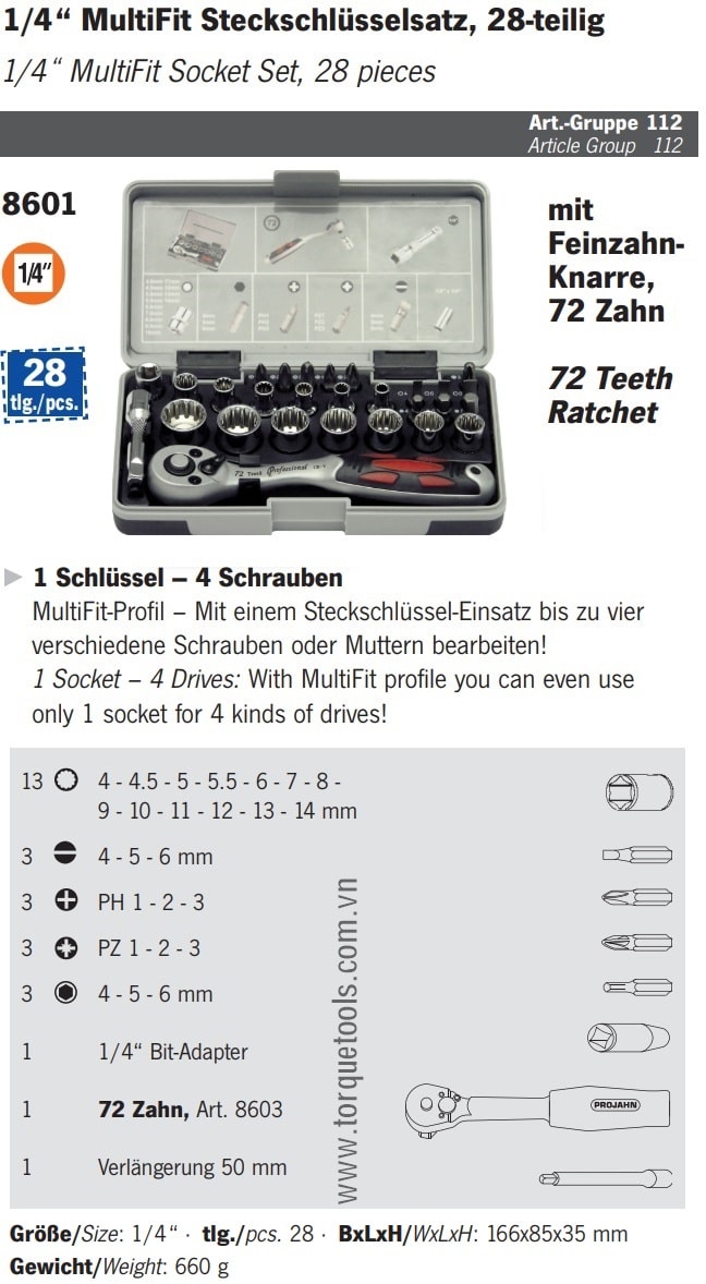 Bộ dụng cụ Projahn 8601, bộ khẩu Projahn 8601 là hộp dụng cụ 28 chi tiết, size khẩu đầu vào 1/4", chuyên dùng để siết/vặn bulong, đai ốc, vít trong công nghiệp.Các chi tiết trong bộ khẩu Projahn 8601 gồm: