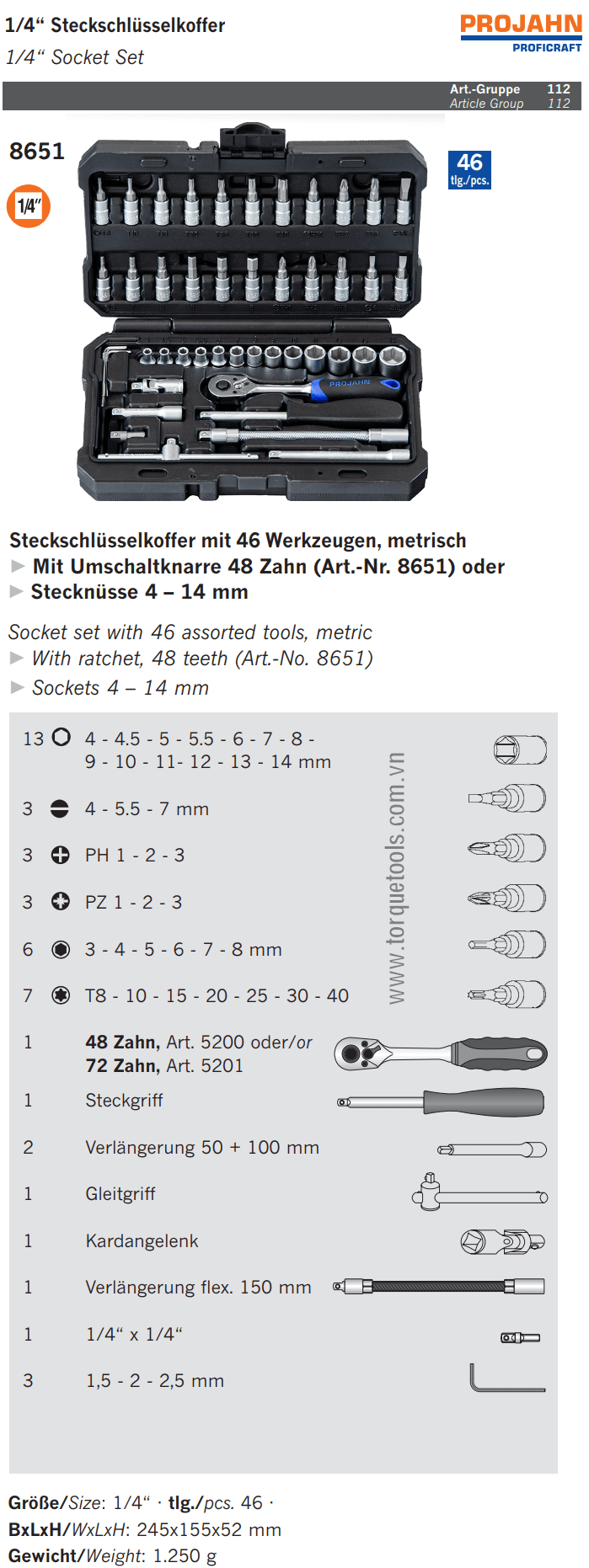 Bộ dụng cụ Projahn 8651, bộ khẩu Projahn 8651 là hộp dụng cụ 46 chi tiết, size khẩu đầu vào 1/4", chuyên dùng để siết/vặn bulong, đai ốc, vít trong công nghiệp.Các chi tiết trong bộ khẩu Projahn 8651 gồm: