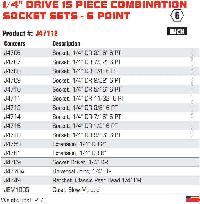 - Khẩu 6 cạnh 1/4"(3/16-9/16"): 12 chiếc.