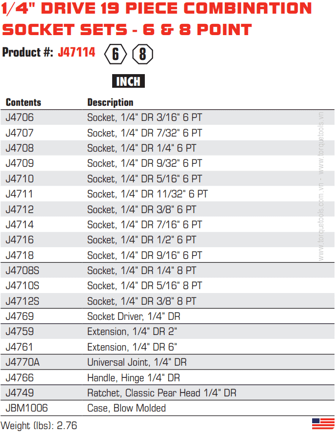 Toàn bộ bộ khẩu Proto J47114 đóng trong hộp thép, trọng lượng: 2.76 kg. Made in USA.