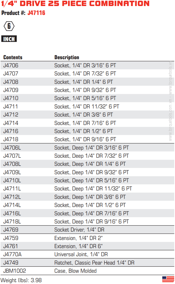 Bộ dụng cụ Proto J47116,bộ khẩu Proto J47116 là hộp dụng cụ 25 chi tiết, size khẩu đầu vào 1/4", chuyên dùng để siết/vặn bulong, đai ốc, vít trong công nghiệp.Các chi tiết trong bộ khẩu Proto J47116 gồm: