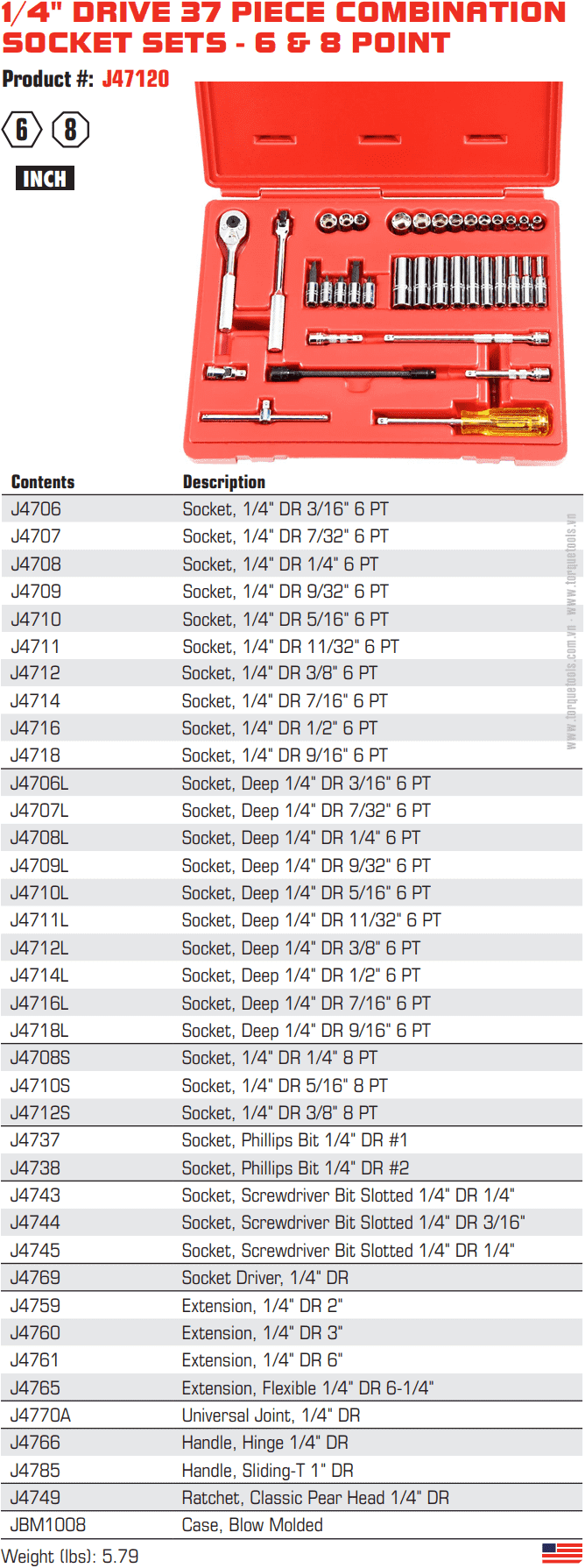 Bộ dụng cụ Proto J47120,bộ khẩu Proto J47120 là hộp dụng cụ 37 chi tiết, size khẩu đầu vào 1/4", chuyên dùng để siết/vặn bulong, đai ốc, vít trong công nghiệp.Các chi tiết trong bộ khẩu Proto J47120 gồm: