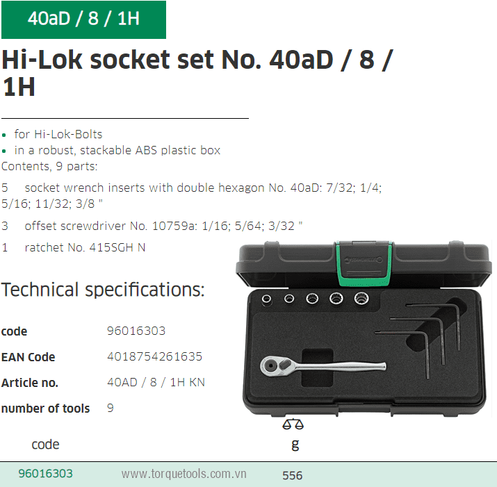 - Toàn bộ bộ khẩu Stahlwille 40AD/8/1H đóng trong hộp nhựa, trọng lượng: 556 g. Made in Germany.