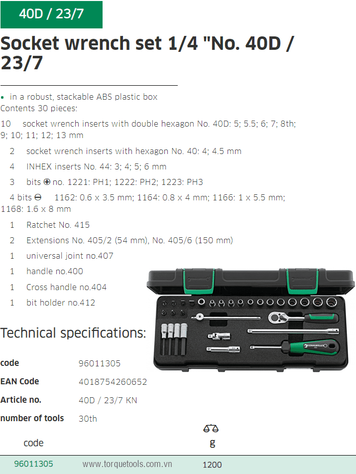 - Toàn bộ bộ khẩu Stahlwille 40D/23/7 đóng trong hộp nhựa, trọng lượng: 1.2 kg. Made in Germany.