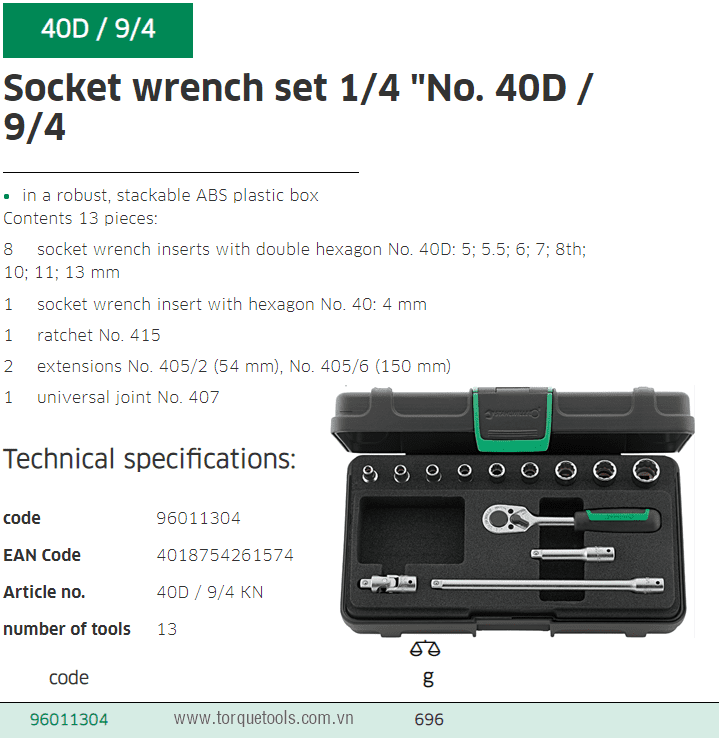 Bộ dụng cụ Stahlwille 40D/9/4 , bộ khẩu Stahlwille 40D/9/4 (Code: 96011304) là hộp dụng cụ 13 chi tiết, size khẩu đầu vào 1/4", chuyên dùng để siết/vặn bulong, đai ốc, vít trong công nghiệp.Các chi tiết trong bộ khẩu Stahlwille 40D/9/4 gồm: