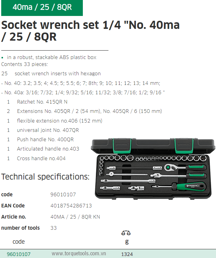 - Toàn bộ bộ khẩu Stahlwille 40ma/25/8QR đóng trong hộp nhựa, trọng lượng: 1.324 kg. Made in Germany.