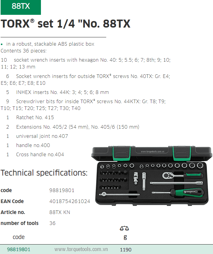 - Toàn bộ bộ khẩu Stahlwille 88TX đóng trong hộp nhựa, trọng lượng: 1.190 kg. Made in Germany.