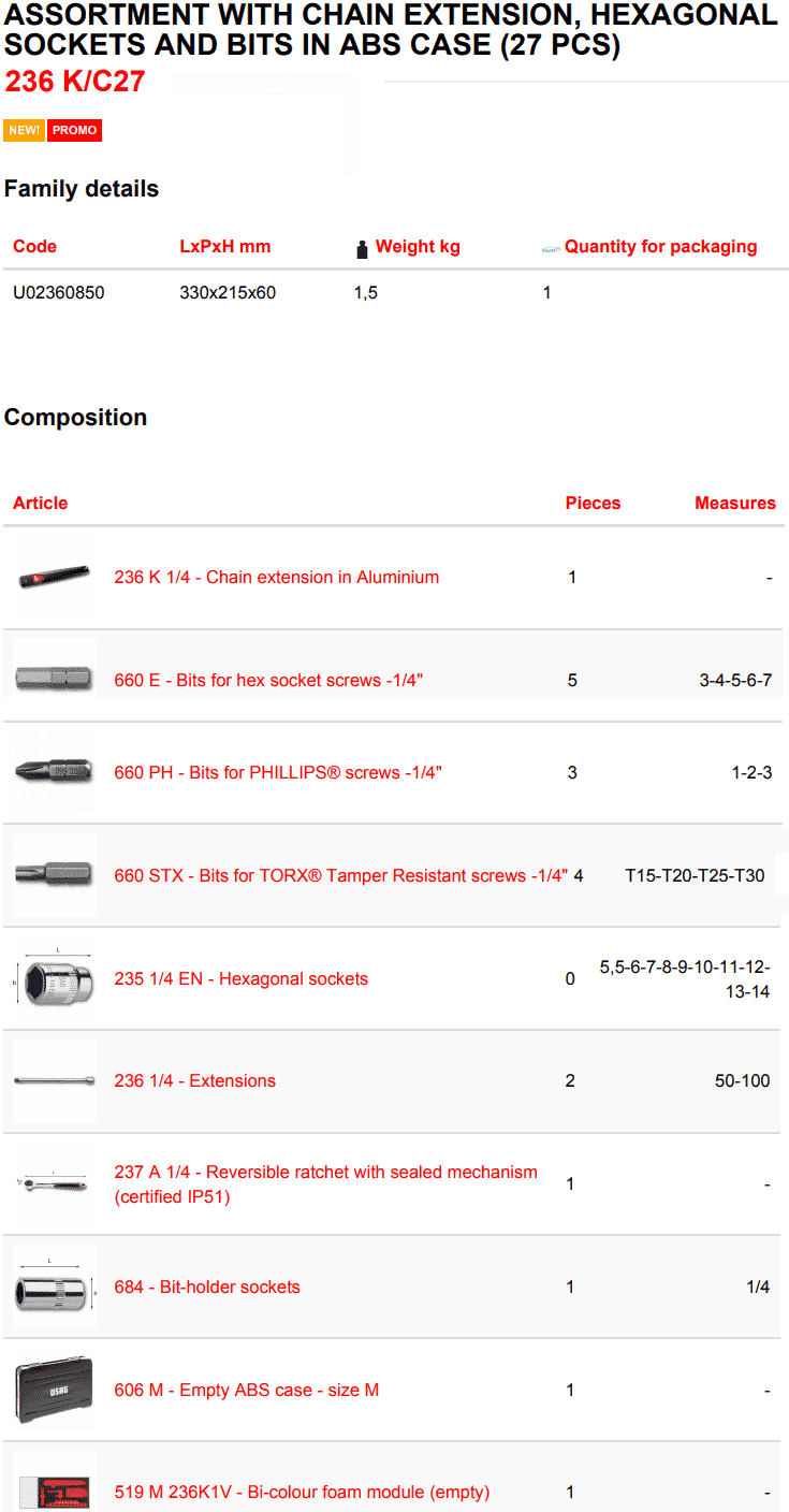 Toàn bộ bộ khẩu USAG 601 1/4 J34 đóng trong hộp nhựa, (190x144x58), trọng lượng: 1 kg. Made in Italy.