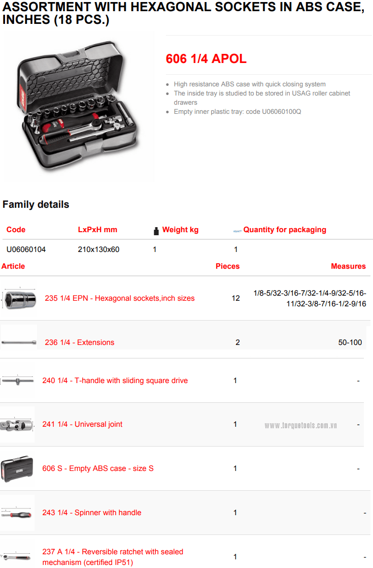 Toàn bộ bộ khẩu USAG 606 1/4 APOL đóng trong hộp nhựa, (210x130x60), trọng lượng: 1 kg. Made in Italy.