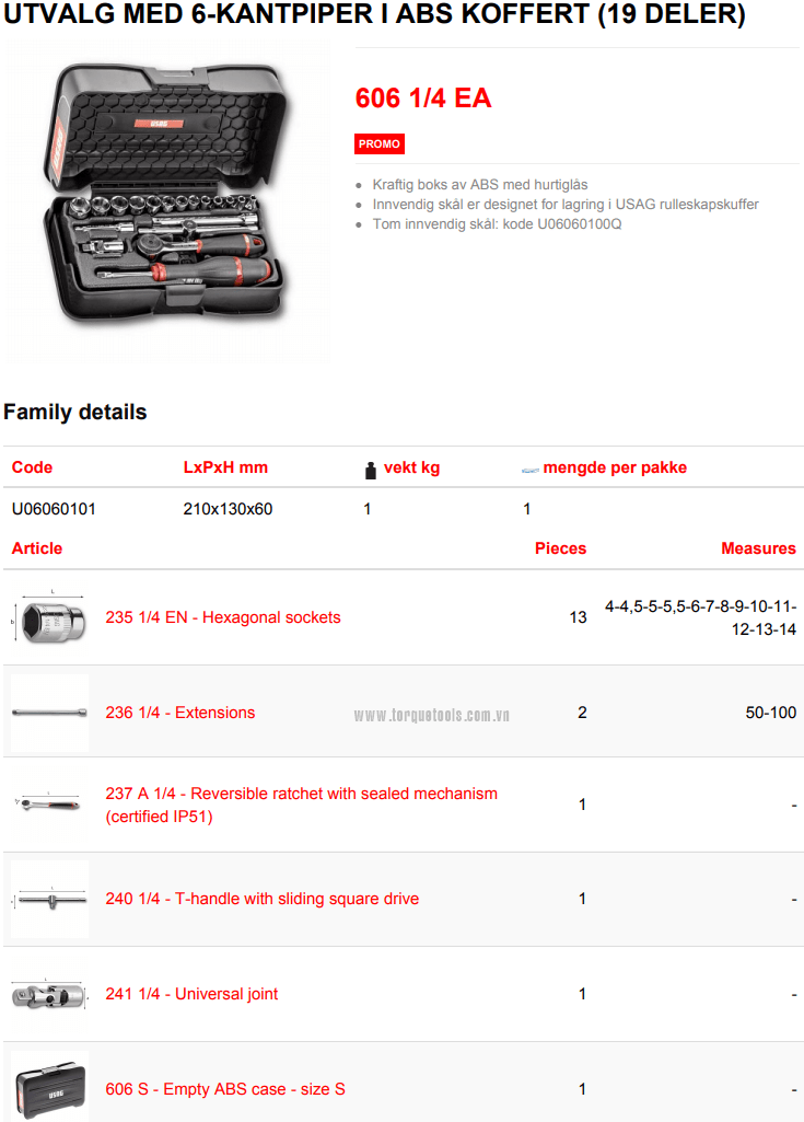 Toàn bộ bộ khẩu USAG 606 1/4 EA đóng trong hộp nhựa, (210x130x60), trọng lượng: 1 kg. Made in Italy.