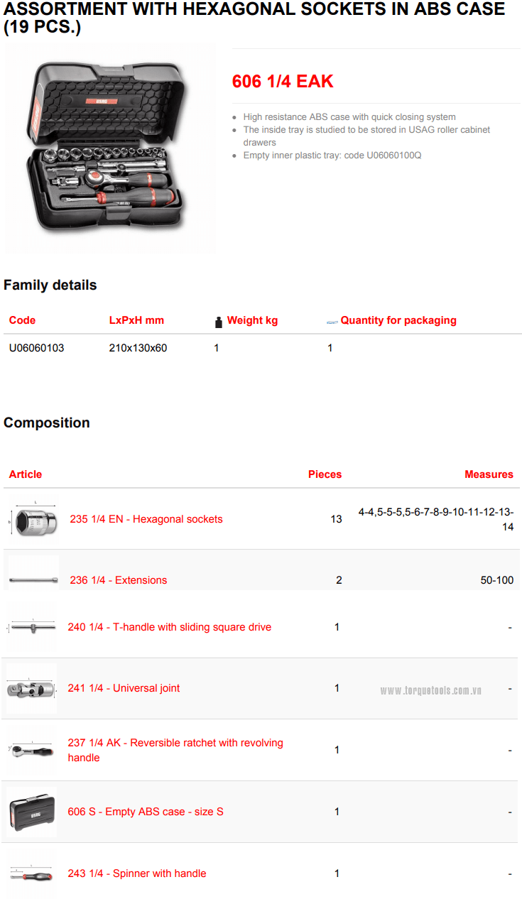 Toàn bộ bộ khẩu USAG 606 1/4 EAK đóng trong hộp nhựa, (210x130x60), trọng lượng: 1 kg. Made in Italy.