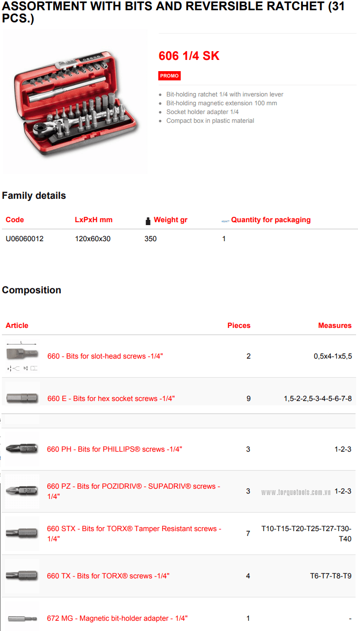 Toàn bộ bộ khẩu USAG 606 1/4 SK đóng trong hộp nhựa, (120x60x30), trọng lượng: 0.35 kg. Made in Italy.