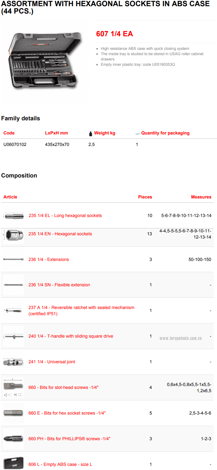 Bộ dụng cụ Usag 607 1/4 EA,bộ khẩu Usag 607 1/4 EA là hộp dụng cụ 44 chi tiết, size khẩu đầu vào 1/4", chuyên dùng để siết/vặn bulong, đai ốc, vít trong công nghiệp.Các chi tiết trong bộ khẩu Usag 607 1/4 EA gồm: