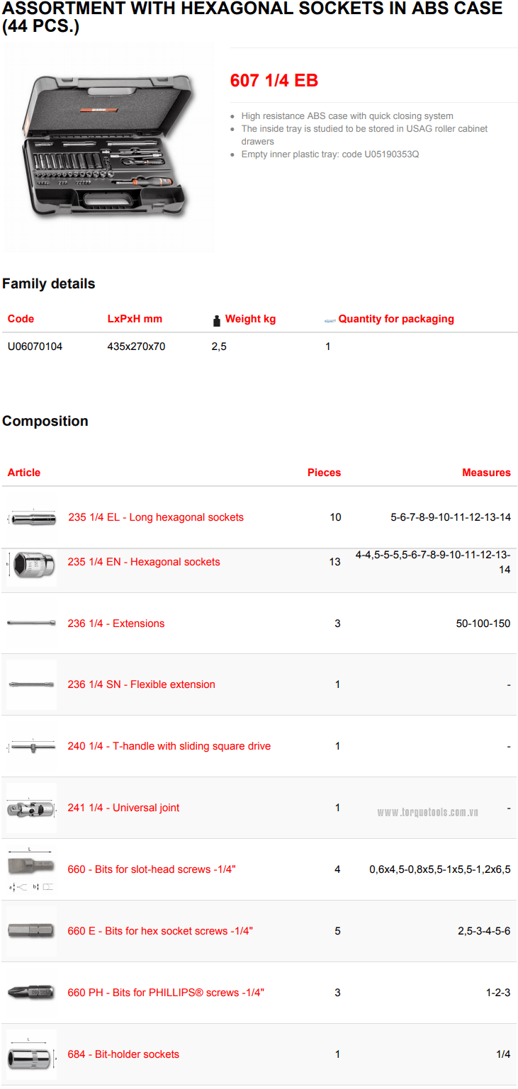 Bộ dụng cụ Usag 607 1/4 EB,bộ khẩu Usag 607 1/4 EB là hộp dụng cụ 44 chi tiết, size khẩu đầu vào 1/4", chuyên dùng để siết/vặn bulong, đai ốc, vít trong công nghiệp.Các chi tiết trong bộ khẩu Usag 607 1/4 EB gồm:
