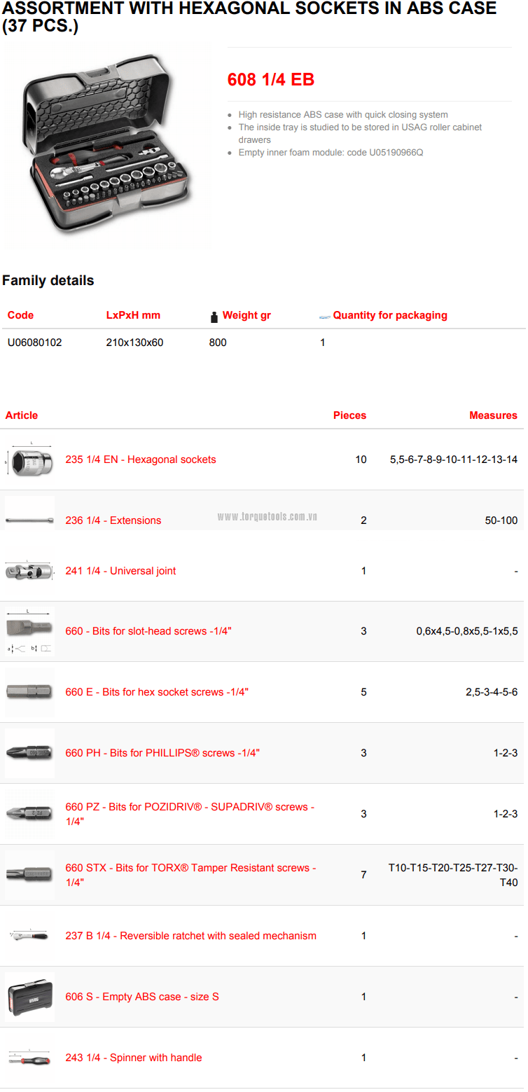 Bộ dụng cụ Usag 608 1/4 EB,bộ khẩu Usag 608 1/4 EB là hộp dụng cụ 37 chi tiết, size khẩu đầu vào 1/4", chuyên dùng để siết/vặn bulong, đai ốc, vít trong công nghiệp.Các chi tiết trong bộ khẩu Usag 608 1/4 EB gồm: