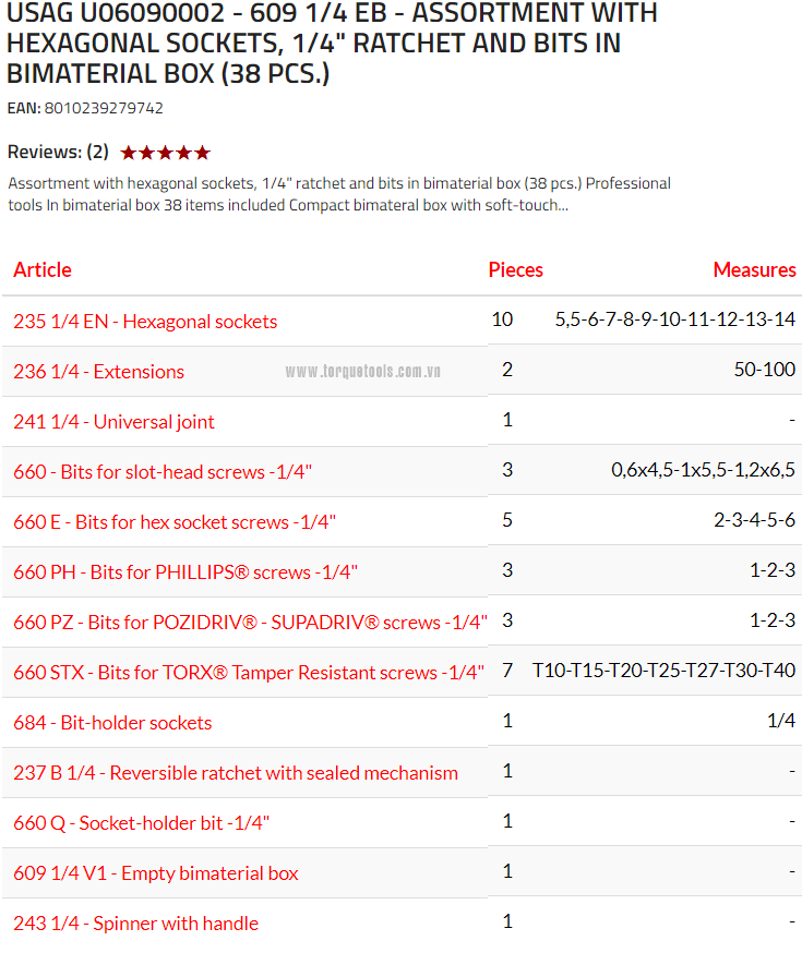 Bộ dụng cụ Usag 609 1/4 EB,bộ khẩu Usag 609 1/4 EB là hộp dụng cụ 38 chi tiết, size khẩu đầu vào 1/4", chuyên dùng để siết/vặn bulong, đai ốc, vít trong công nghiệp.Các chi tiết trong bộ khẩu Usag gồm: