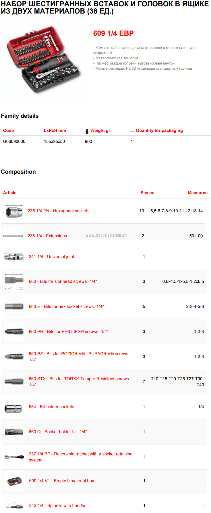 Toàn bộ bộ khẩu USAG 609 1/4 EBP đóng trong hộp nhựa, (155x95x50), trọng lượng: 0.9 kg. Made in Italy.