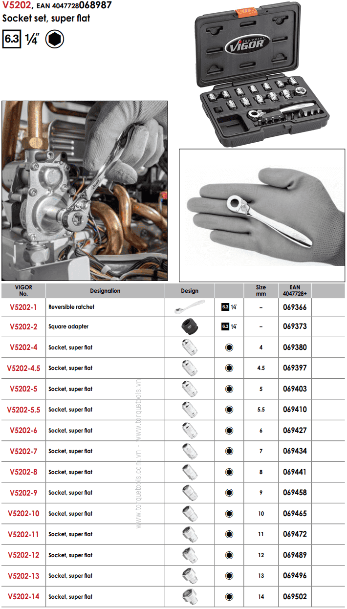 - Khẩu 6 cạnh 1/4" dòng V5202(4-14 mm): 13 chiếc.
