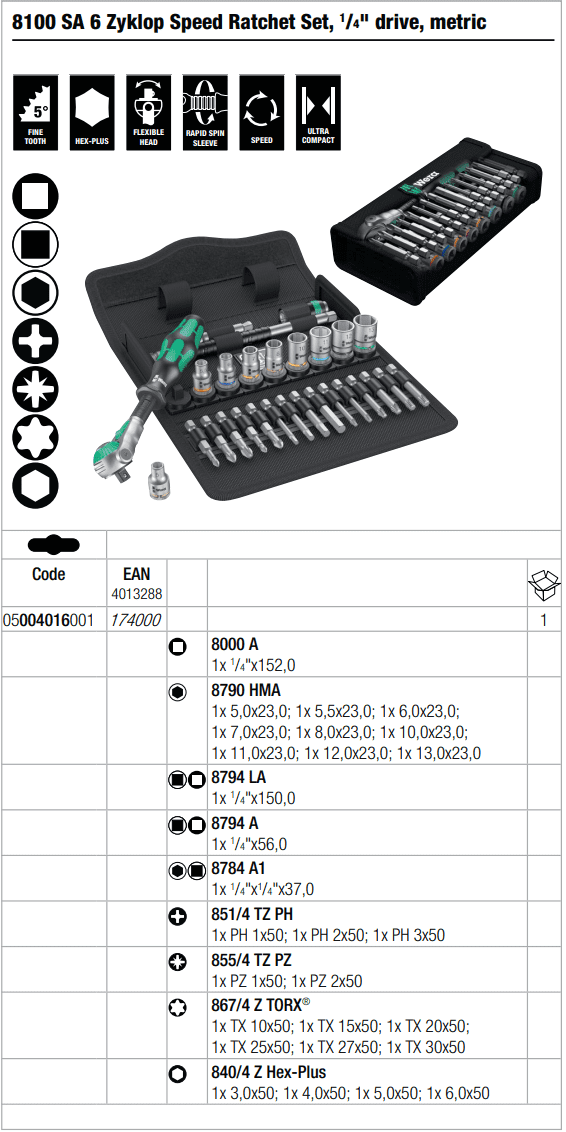 Bộ khẩu Wera 05004016001, Wera socket set 05004016001: có 29 chi tiết, size khẩu đầu vào 1/4", chuyên dùng để siết/vặn bulong, đai ốc, vít trong công nghiệp.Các chi tiết trong bộ khẩu Wera 05004016001 gồm:
