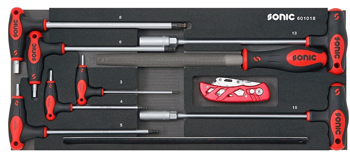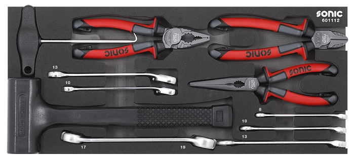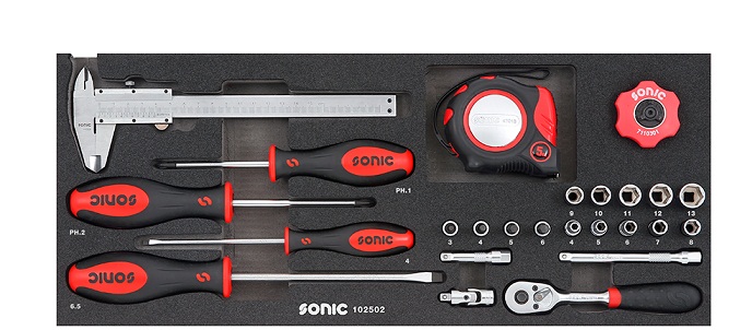 - Bộ dụng cụ Sonic 704721, Thùng dụng cụ Sonic 704721 là hộp dụng cụ 47 chi tiết, trong đó có các loại kìm, tô vít, cờ lê tròng, thước cặp, thước dây, dao rạch, khẩu và tay vặn đa năng 1/4".