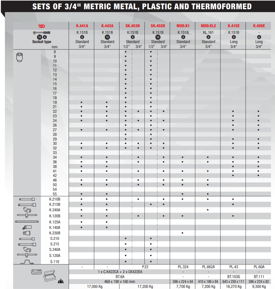 - Bộ khẩu Facom K.442E, Facom socket set K.442E: gồm 22 chi tiết, được đóng trong hộp loại. Gồm 15 khẩu chụp 3/4" (19-55mm), khẩu nối dài 3/4" bộ chuyển đổi khẩu 3/4", tay vặn và các tools khác