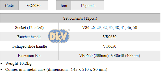 - Khẩu 12 cạnh VS6-26, 29, 32, 35, 38, 41, 46, 50: 8 chiếc.