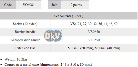 - Khẩu 12 cạnh VS6-24, 27, 30, 32, 36, 41, 46, 50: 8 chiếc.