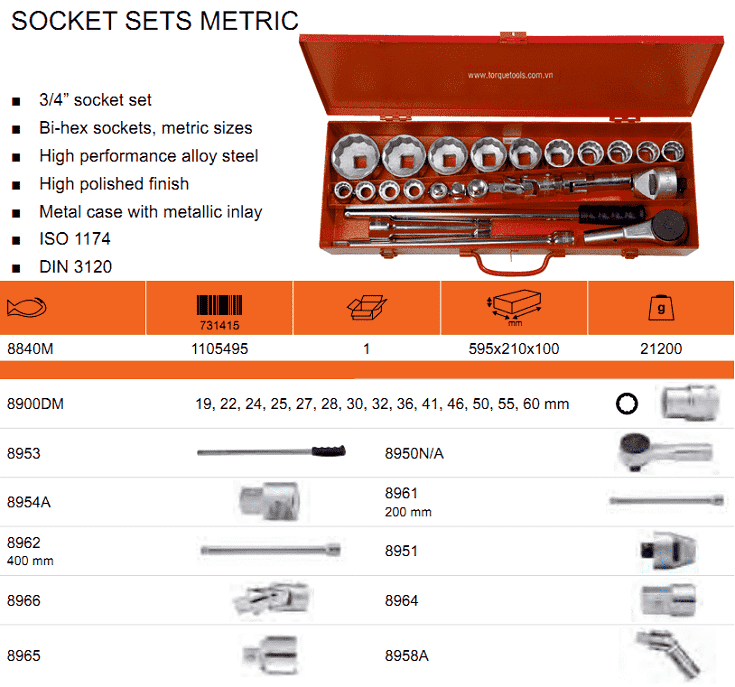 - Khẩu 12 cạnh 8900DM 3/4" (19 - 60 mm): 14 chiếc.