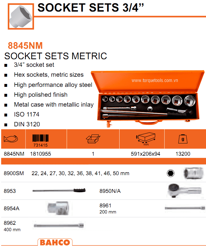 Bộ khẩu Bahco 8845NM, Bahco socket set 8845NM có 15 chi tiết, size khẩu đầu vào 3/4", đóng trong hộp thép, chuyên dùng để siết/vặn bulong, đai ốc, vít trong công nghiệp.Các chi tiết trong bộ khẩu Bahco 8845NM gồm: