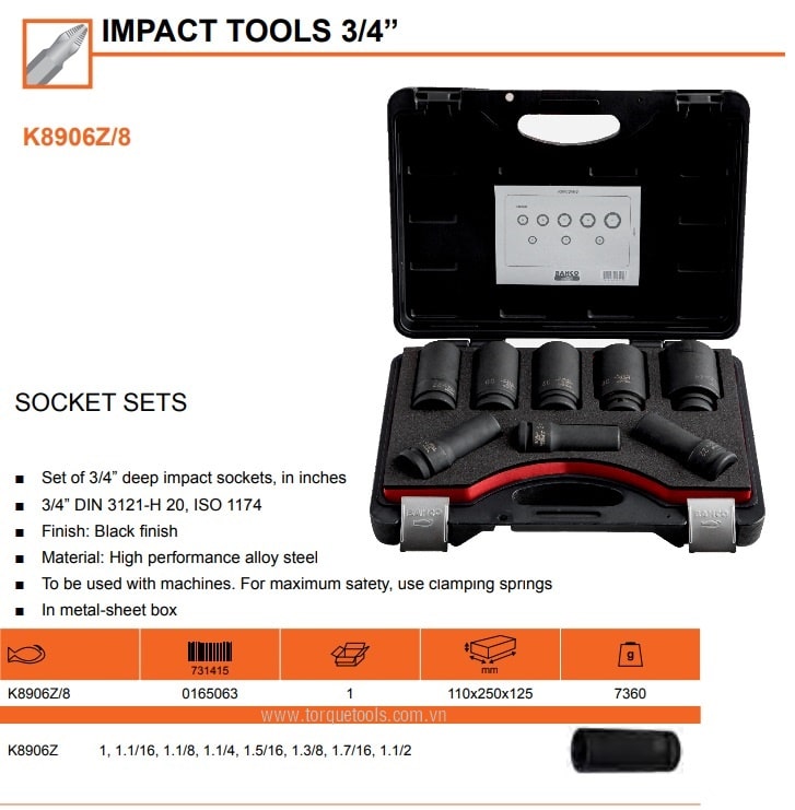BỘ KHẨU BAHCO K8906Z/8 | BAHCO SOCKET SET K8906Z/8 | 3/4" | 8 chi tiết
