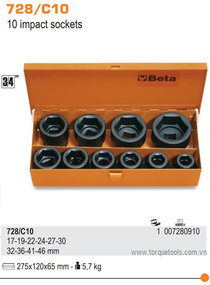 Bộ khẩu BETA 728/C10, BETA socket set 728/C10 có 10 chi tiết, size khẩu đầu vào 3/4", đóng trong hộp thép , chuyên dùng để siết/vặn bulong, đai ốc, trong công nghiệp.Các chi tiết trong bộ khẩu BETA 728/C10 gồm: