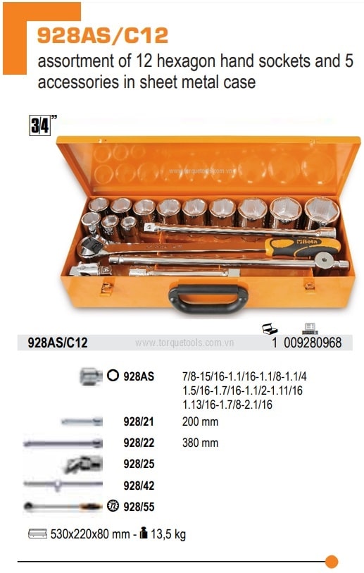 Bộ khẩu BETA 928AS/C12, BETA socket set 928AS/C12 có 17 chi tiết, size khẩu đầu vào 3/4", đóng trong hộp thép , chuyên dùng để siết/vặn bulong, đai ốc, vít trong công nghiệp.Các chi tiết trong bộ khẩu BETA 928AS/C12 gồm: