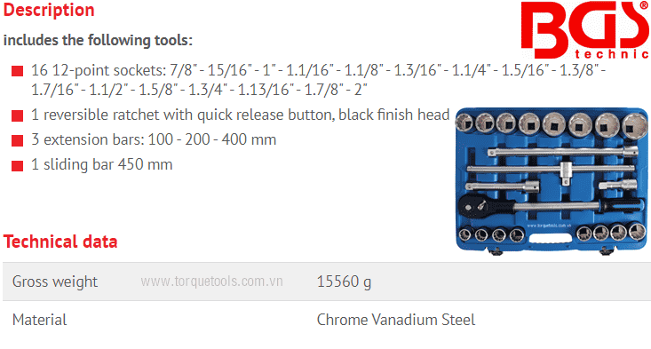 Toàn bộ bộ khẩu BGS 1107 đóng trong hộp nhựa, trọng lượng: 15.56 kg. Made in USA.