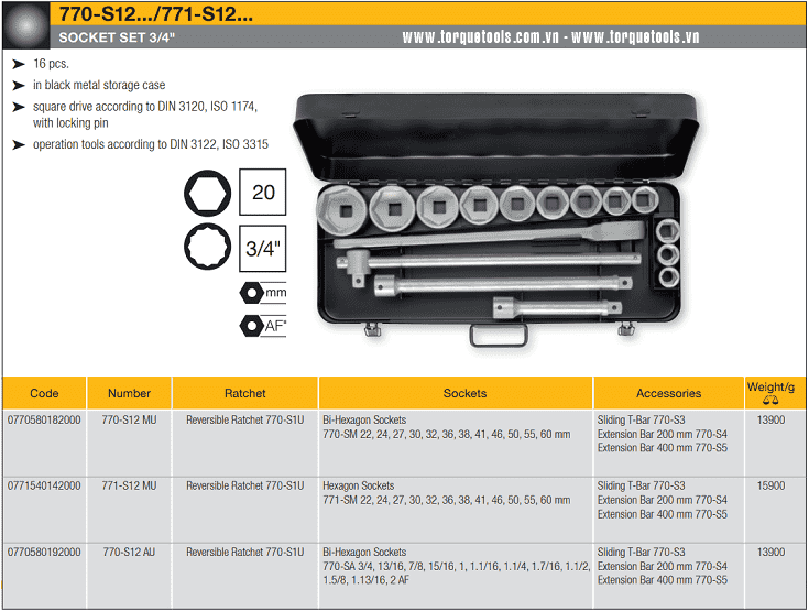 - Khẩu 3/4", 12 cạnh dòng 770-SA (3/4" - 2")AF: 12 chiếc.