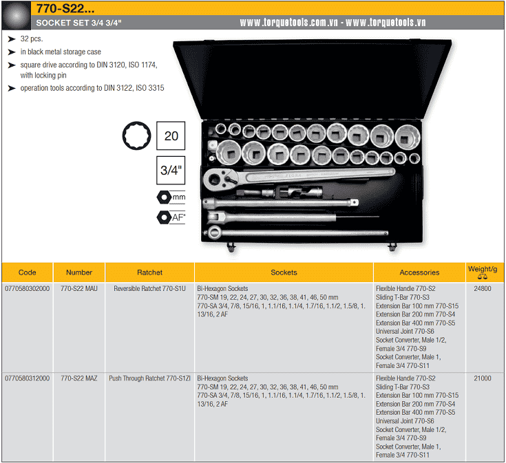 - Khẩu 3/4", 12 cạnh dòng 770-SM (19 - 50 mm): 11 chiếc.