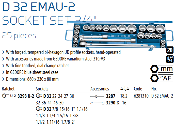 BỘ KHẨU GEDORE D 32 EMAU-2 | GEDORE SOCKET SET D 32 EMAU-2 | 3/4" | 25 chi tiết