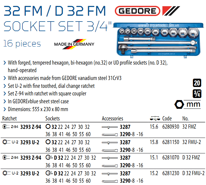 BỘ KHẨU GEDORE D 32 FMU-2 | GEDORE SOCKET SET D 32 FMU-2 | 3/4" | 16 chi tiết