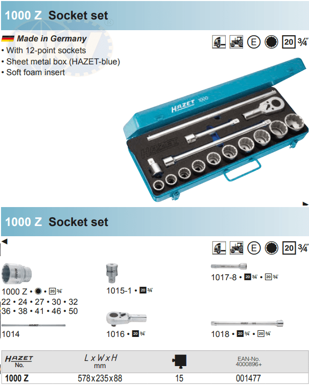 Bộ dụng cụ Hazet 1000Z, bộ khẩu Hazet 1000Z (Code: ) là hộp dụng cụ 15 chi tiết,size khẩu đầu vào 3/4", chuyên dùng để siết/vặn bulong, đai ốc, vít trong công nghiệp.Các chi tiết trong bộ khẩu Hazet gồm: