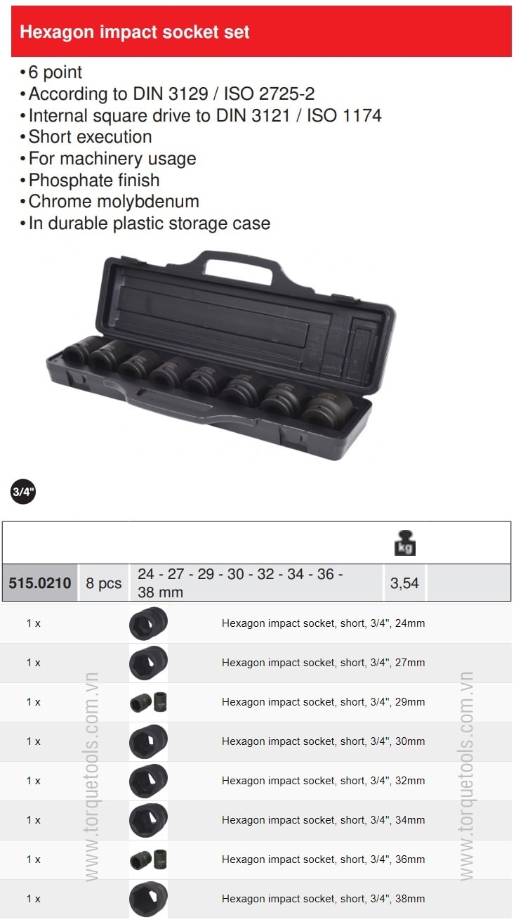 - Khẩu chụp 3/4" 515.0210 (24 - 38 mm): 8 chiếc.